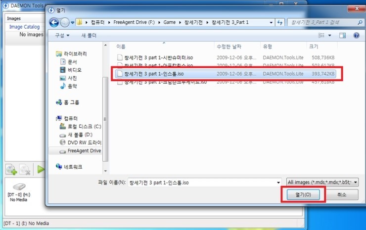 가상 드라이브 위에서 DVD/CD 미디어의 이미지를 마운트한다.